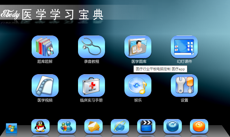 醫學學習機,醫學智能學習機,醫學智能寶典,醫學智能學習寶典,簡稱Ebody,一款專為醫學專業學生量身打造的掌上學習機,它集醫學學習(基礎教程、臨床教程、臨床技能、模擬考試、系統疾病解析、臨床實習手冊)和娛樂功能為一體,是醫學學生勝利通過執業醫師考試和提高醫學技能的必備寶典。